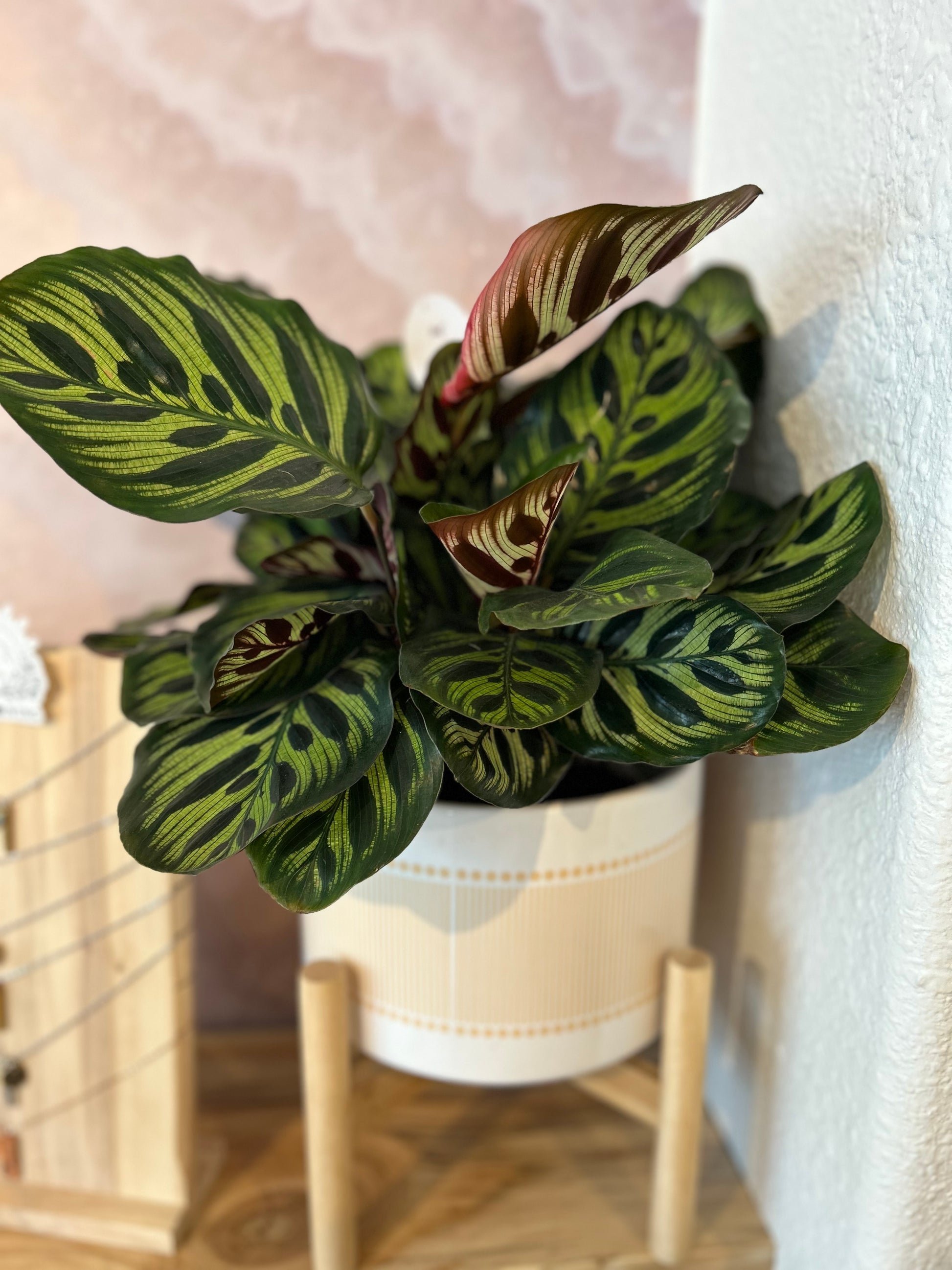 Calathea needs light that mimics its natural habitat in the understory where there is no direct sun. The potting medium should be lightweight, rich in organic matter, and slightly acidic. Water the plant enough to keep the soil moist at all times but not wet and fertilize it once a month except during the winter. The plant is highly sensitive to cold and grows best in a warm, humid environment so ensure the air in your home isn’t too dry.